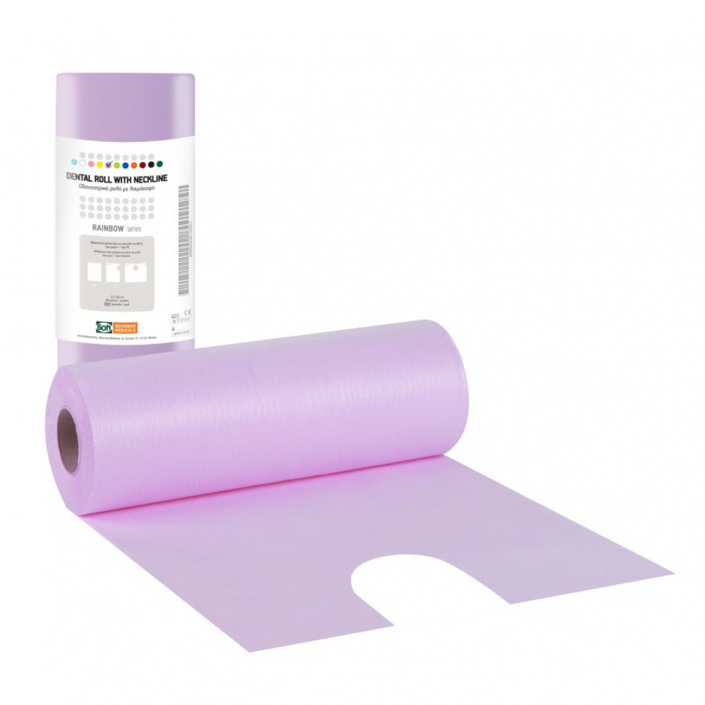 Οδοντιατρική πετσέτα μωβ με λαιμόκοψη σε ρολό για την προστασία του ασθενή, μεγάλης απορροφητικότητας και αντοχής. Αποτελείται από ένα φύλλο ιατρικού τύπου πολυαιθυλένιο (ΡΕ),το οποίο βρίσκεται στο κάτω μέρος και δύο φύλλα χαρτί εξαιρετικής ποιότητας και αντοχής το οποίο βρίσκεται στο επάνω μέρος. Είναι ιδανική για ιατρικούς χώρους, οδοντιατρεία, κέντρα αισθητικής κ.α.