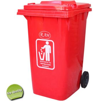 Πλαστικός κάδος σκουπιδιών, με καπάκι και ρόδες.