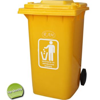 Πλαστικός κάδος σκουπιδιών, με καπάκι και ρόδες.