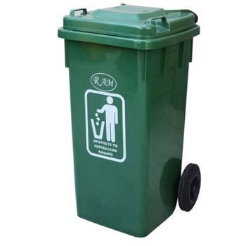 Πλαστικός κάδος σκουπιδιών με καπάκι και ρόδες.