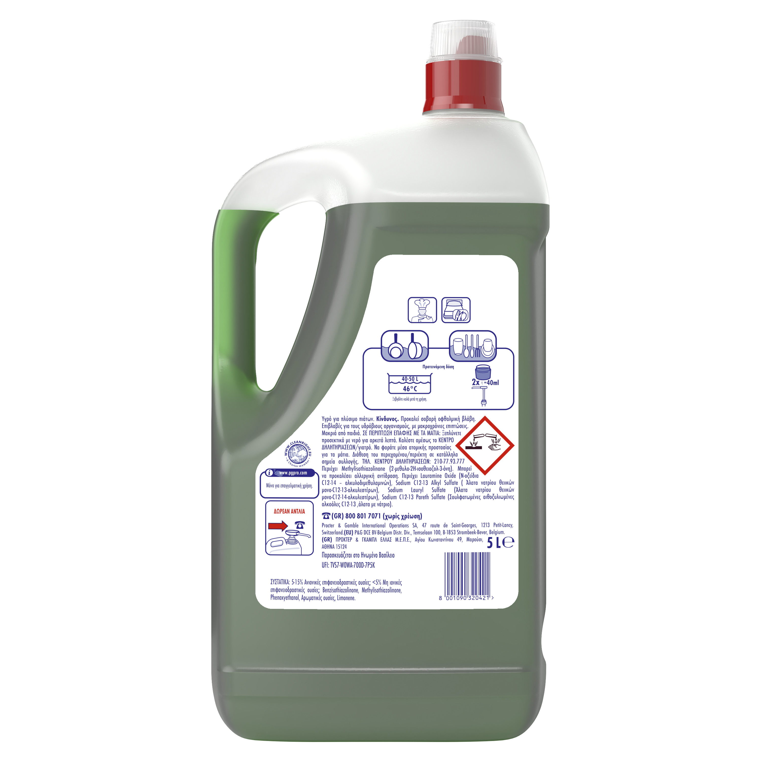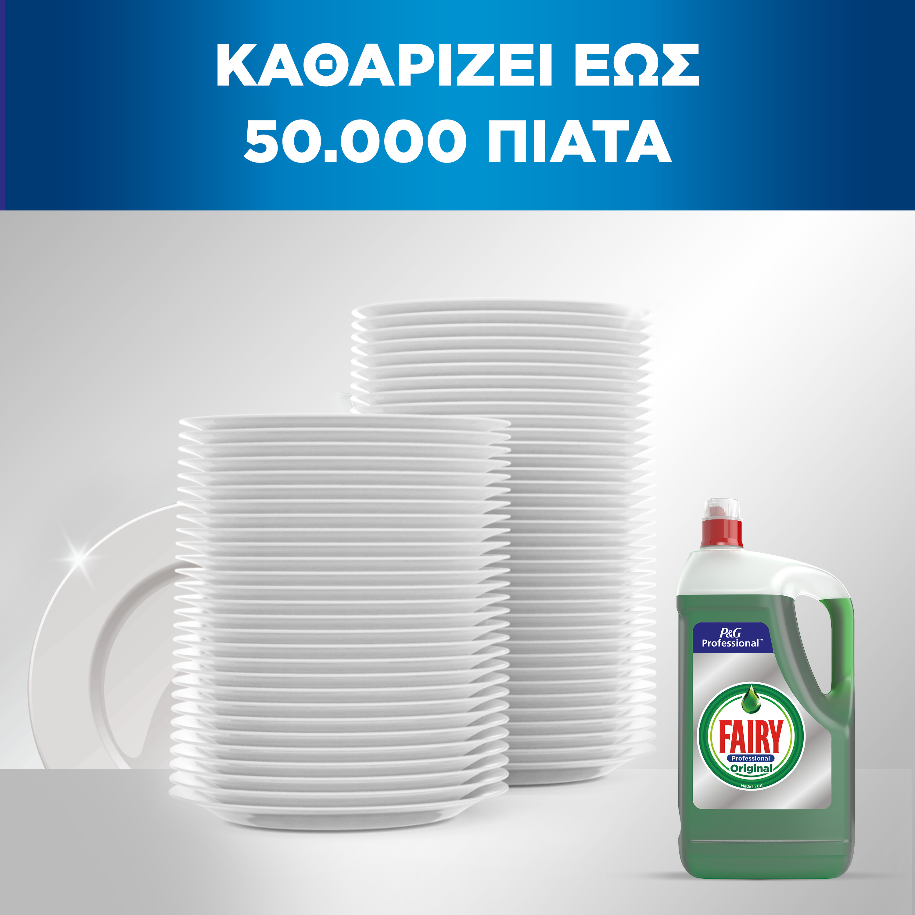 Το Fairy Original από την επαγγελματική σειρά της P&G είναι ένα υγρό για πλύσιμο πιάτων και άλλων σκευών κουζίνας στο χέρι. Διαθέτει ισχυρή επαγγελματική συμπυκνωμένη σύνθεση με επιφανειοδραστικές ουσίες για μέγιστη αποτελεσματικότητα στην αφαίρεση σκληρών/λιπαρών ρίπων. Εξασφαλίζει άψογα αποτέλεσμα και στο κρύο νερό. Έχει αποτελεσματική δράση μουλιάσματος και πετυχαίνει εύκολο ξέπλυμα και εξαιρετική λάμψη. Μία φιάλη 5L μπορεί να καθαρίσει έως και 50.000 πιάτα.
