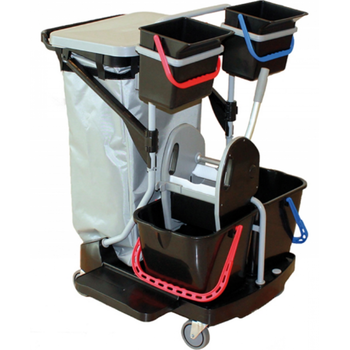 Kαρότσι καθαρισμού με 2 κάδους και πρέσσα, 2 βαθιά ράφια για είδη ιματισμού και σάκο απορριμμάτων.