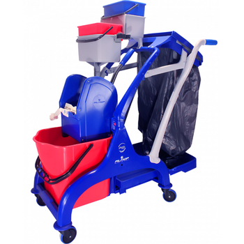 Επαγγελματικό, σύνθετο καρότσι, με μονό κουβά σφουγγαρίσματος, με πρέσσα και λαβές για εύκολη μετακίνηση, βάση και στήριγμα σακούλας σκουπιδιών 100lt, με τεντωτήρες σακούλας και καπάκι.