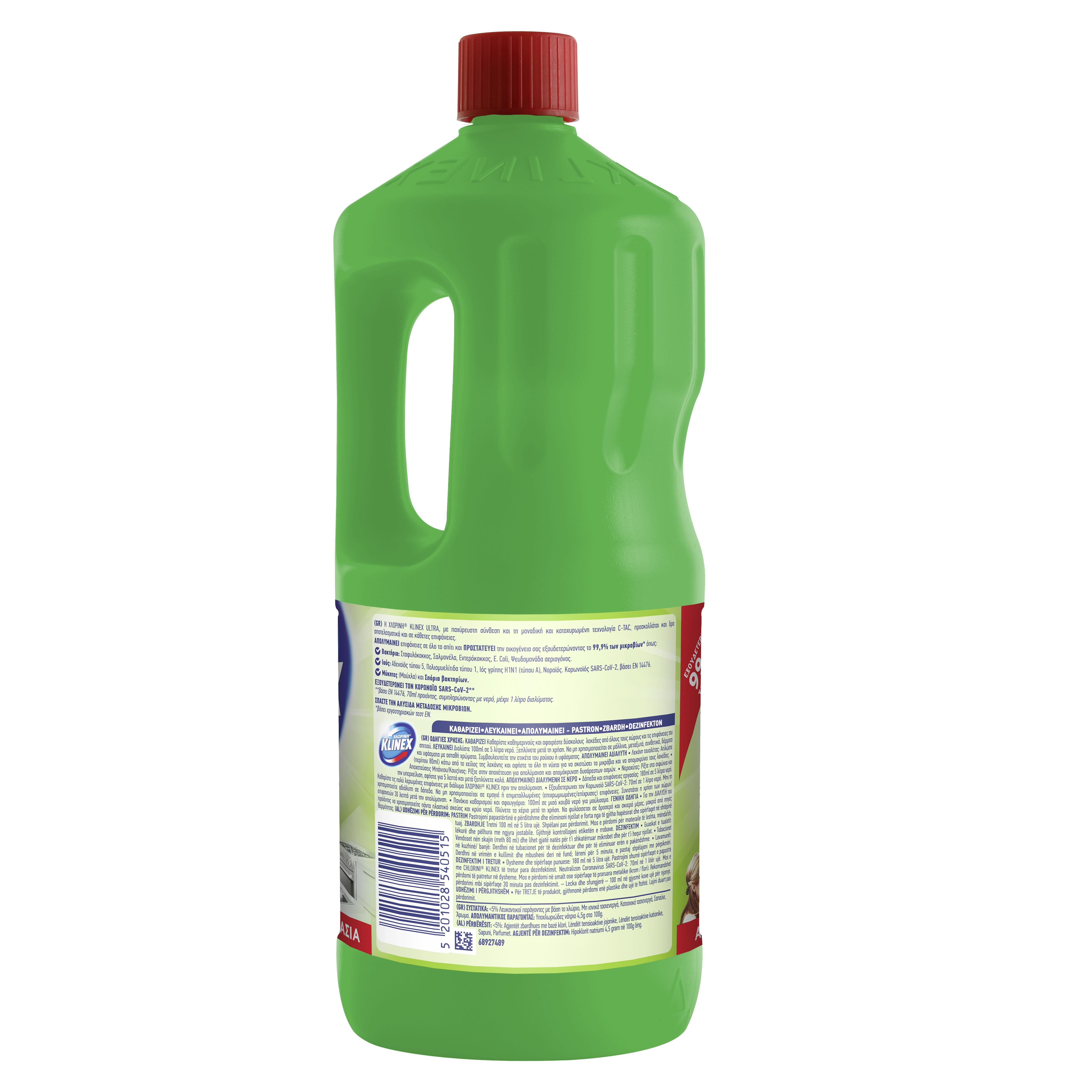 Η Χλωρίνη® Klinex Ultra με παχύρευστη σύνθεση απολυμαίνει επιφάνειες σε όλο το σπίτι και προστατεύει την οικογένεια σας εξουδετερώνοντας το 99,9% των μικροβίων! Πιο συγκεκριμένα, εξουδετερώνει: