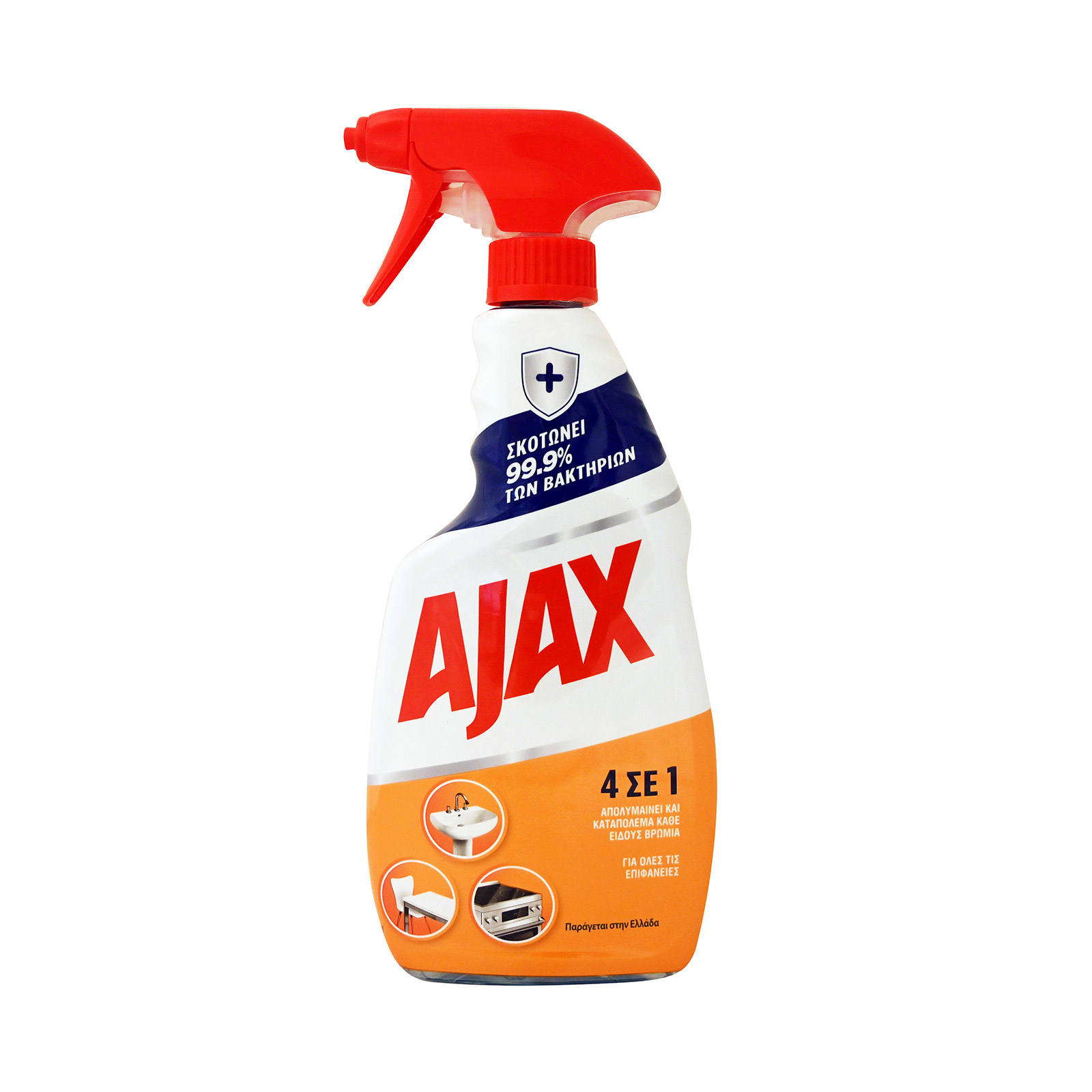 Το Ajax 4 ΣΕ 1 Καθαριστικό Spray έχει 100% καθαριστική δύναμη για την αντιμετώπιση κάθε είδους βρωμιάς. Το spray καθαρισμού για όλες τις χρήσεις έχει 99% συστατικά φυσικής προέλευσης και έρχεται σε ένα ανακυκλωμένο πλαστικό μπουκάλι που μπορείτε να ανακυκλώσετε για να συμβάλετε στην προστασία του πλανήτη.