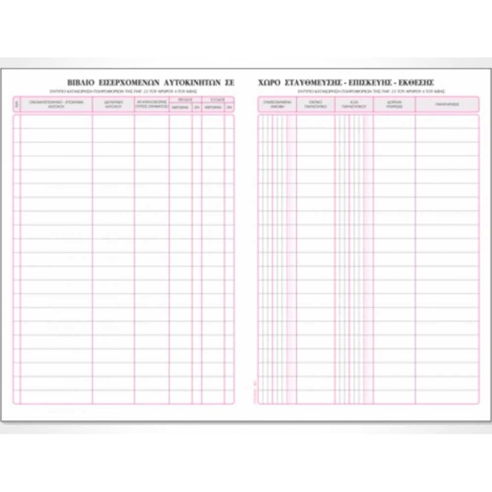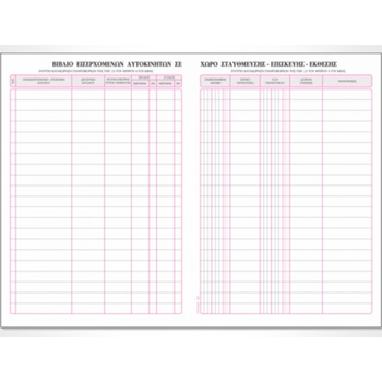 Βιβλίο Εισερχομένων Αυτοκινήτων για την καταγραφή οποιουδήποτε αυτοκινήτου εισήρθε για επισκευή – στάθμευση – έκθεση σε οποιοδήποτε ιδιωτικό χώρο, διαστάσεως 21x30, με σκληρό εξώφυλλο.
