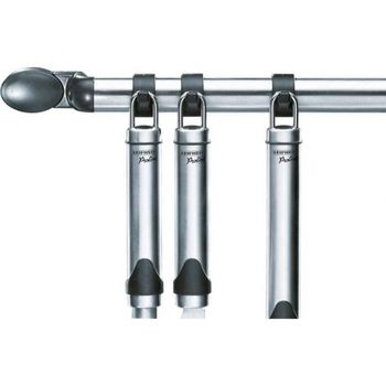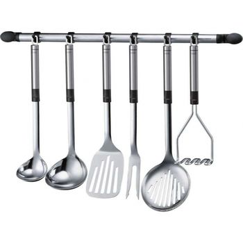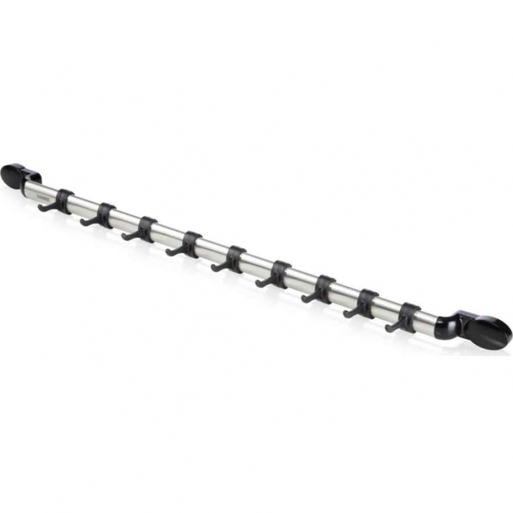 Επιτοίχια κρεμάστρα για σκεύη κουζίνας με 9 άγκιστρα. Κατασκευασμένη από ανοξείδωτο ατσάλι και μαύρο πλαστικό. Τα άγκιστρα κινούνται πάνω στη ράγα για καλύτερη διαχείριση χώρου.