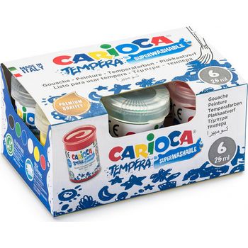 Τέμπερες Carioca σε 6 χρώματα: λευκό, μαύρο, κόκκινο, κίτρινο, μπλε και πράσινο. Η συσκευασία περιλαμβάνει 6 δοχεία των 25ml. Ιδανικές για ζωγραφική σε χαρτί και χαρτόνι χειροτεχνίας.