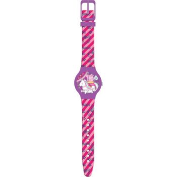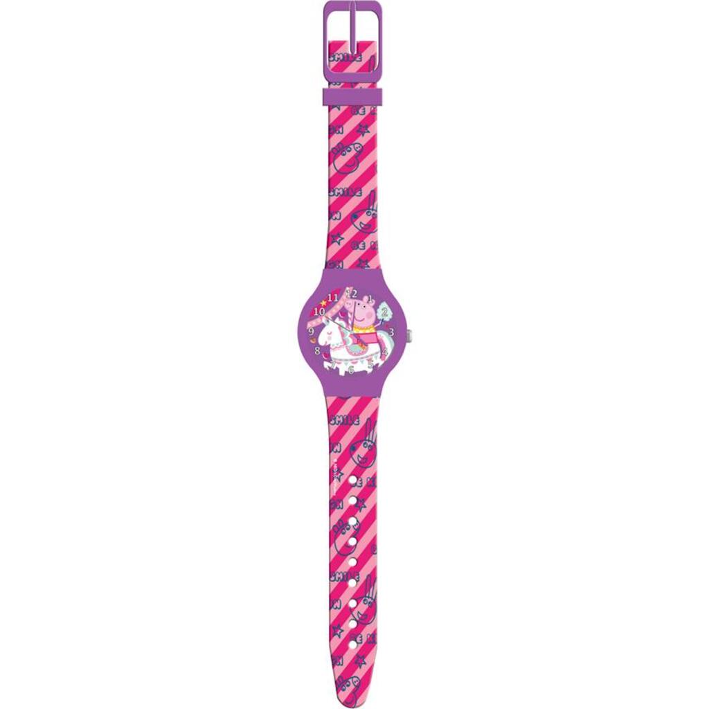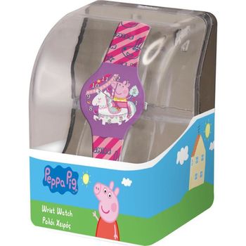 Αναλογικό ρολόι ροζ σε πλαστικό κουτί και καντράν μωβ με σχέδιο Peppa Pig