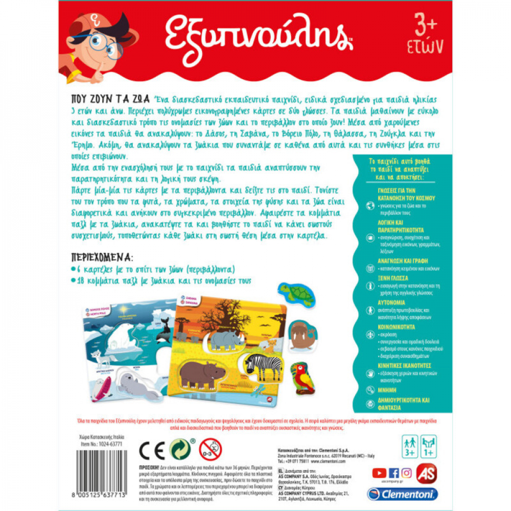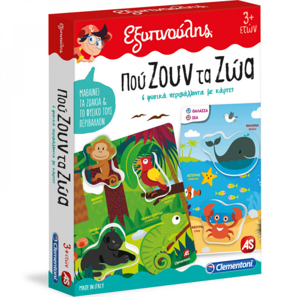 Το Πού ζουν τα ζώα είναι ένα διασκεδαστικό εκπαιδευτικό παιχνίδι, ειδικά σχεδιασμένο για παιδιά ηλικίας 3 ετών και άνω. Περιέχει πολύχρωμες εικονογραφημένες κάρτες σε δύο γλώσσες.