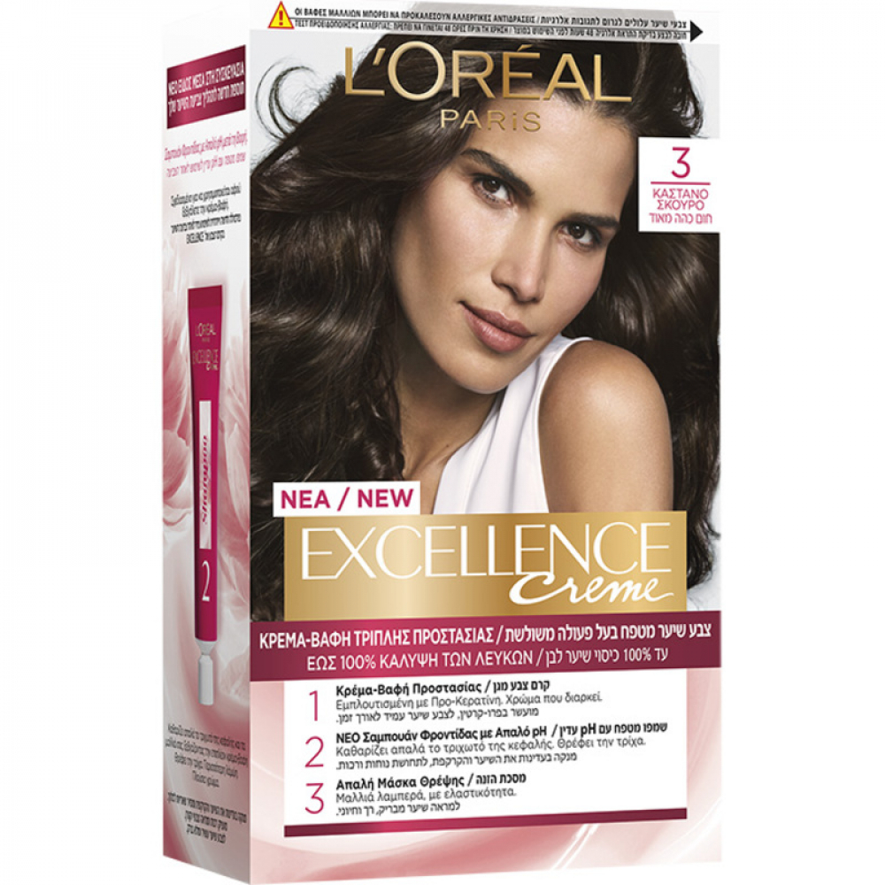 Η Excellence Creme της L'Oreal Paris, είναι η πρώτη μας βαφή με ειδική σύνθεση που δεν στάζει και φόρμουλα εμπλουτισμένη με Προκερατίνη, αναδομεί και αναζωογονεί τα μαλλιά.