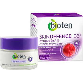 Η αντιρυτιδική κρέμα ημέρας bioten Defence Day Cream με SPF15 είναι εμπλουτισμένη με 100% φυσικά συστατικά που βοηθούν στην πρόληψη της πρόωρης γήρανσης και προστατεύουν από τις UVA/UVB ακτινοβολίες.