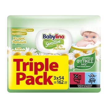 Τα μωρομάντηλα Babylino Sensitive Chamomile χωρίς άρωμα, χάρη στην απαλή υποαλλεργική σύνθεσή τους με εκχύλισμα οργανικού χαμομηλιού, καθαρίζουν απαλά και περιποιούνται το ευαίσθητο βρεφικό δέρμα, ενώ παράλληλα συμβάλλουν στην προστασία από ερεθισμούς και συγκάματα. Απαλά και με πρακτικό καπάκι που ανοιγοκλείνει για ασφαλή διατήρηση της υγρασίας του προϊόντος, χωρίς να στεγνώνει. Συνιστώνται από την Ελληνική Εταιρεία Παιδιατρικής Δερματολογίας.Παράγονται ανέπαφα στην Ελλάδα από την 100% ελληνική εταιρεία ΜΕΓΑ Α.Ε. Χωρίς άρωμα. Με υποαλλεργική σύνθεση. Δερματολογικά ελεγμένα σε ευαίσθητα δέρματα. Με λοσιόν που αποτελείται από συστατικά, κυρίως φυσικής προέλευσης, κατάλληλα επιλεγμένα για χρήση στη βρεφική επιδερμίδα. Με μαντήλι που περιέχει φυτικές ίνες. Με φιλικό προς το δέρμα pH. Χωρίς παραβένες, οινόπνευμα, χρωστικές, φθαλυκούς εστέρες, προπυλενογλυκόλη και σιλικόνες. Σε 100% ανακυκλώσιμη συσκευασία*. Σε συσκευασία των 162 τεμαχίων (54x3). *Ελέγξτε τις τοπικές διαδικασίες ανακύκλωσης.