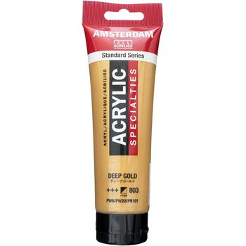 Blank page Ακρυλικό χρώμα Deep Gold 803 της σειράς Amsterdam All Acrylics Specialties Standard Series σε συσκευασία των 120ml. Τα χρώματα Amsterdam Standard Series είναι εξαιρετικής ποιότητας ακρυλικά χρώματα με την εγγύηση της Ολλανδικής Royal Talens. Φτιαγμένα με υψηλής ποιότητας, ανθεκτικές στο φως χρωστικές, εχουν βαθμολογία αντοχής στο φως +++ (100+ χρόνια υπό συνθήκες μουσείου). Η σειρά Standard σας προσφέρει μία ευρεία γκάμα από εξαιρετικά ζωντανά αδιαφανή ακρυλικά χρώματα, εύκολα στη χρήση, τα οποία προσφέρουν ομαλή εφαρμογή. Χρησιμοποιήστε το χρώμα απευθείας από το σωλήνα ή αραιωμένο με λίγο νερό ή ένα από τα διαλυτικά για ακρυλικά χρώματα. Είναι κατασκευασμένα με 100% συνδετικό ακρυλικής ρητίνης, με αποτέλεσμα μια εξαιρετικά ανθεκτική και εύκαμπτη μεμβράνη βαφής με ομοιόμορφο βαθμό γυαλάδας. Άοσμη φόρμουλα με βάση το νερό η οποία γίνεται αδιάβροχη και με μέγάλη αντοχή όταν στεγνώσει. Προσκολλάται σχεδόν σε οποιαδήποτε ελαφρώς πορώδη επιφάνεια, συμπεριλαμβανομένου καμβά, χαρτιού, χαρτονιού, ξύλου, πέτρας και τσιμέντου.