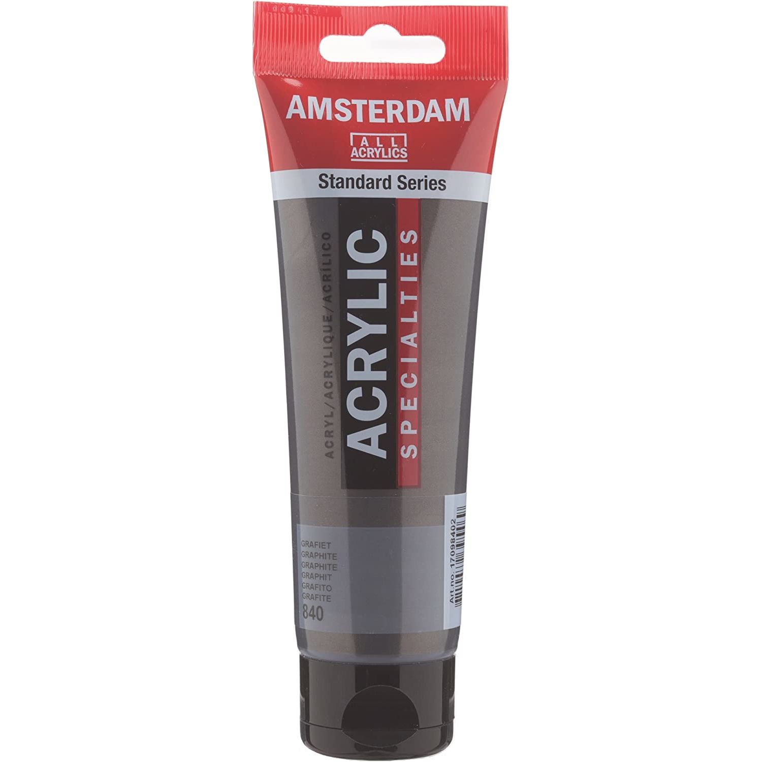 Blank page Ακρυλικό χρώμα Graphite 840 της σειράς Amsterdam All Acrylics Specialties Standard Series σε συσκευασία των 120ml. Τα χρώματα Amsterdam Standard Series είναι εξαιρετικής ποιότητας ακρυλικά χρώματα με την εγγύηση της Ολλανδικής Royal Talens. Φτιαγμένα με υψηλής ποιότητας, ανθεκτικές στο φως χρωστικές, εχουν βαθμολογία αντοχής στο φως +++ (100+ χρόνια υπό συνθήκες μουσείου). Η σειρά Standard σας προσφέρει μία ευρεία γκάμα από εξαιρετικά ζωντανά αδιαφανή ακρυλικά χρώματα, εύκολα στη χρήση, τα οποία προσφέρουν ομαλή εφαρμογή. Χρησιμοποιήστε το χρώμα απευθείας από το σωλήνα ή αραιωμένο με λίγο νερό ή ένα από τα διαλυτικά για ακρυλικά χρώματα. Είναι κατασκευασμένα με 100% συνδετικό ακρυλικής ρητίνης, με αποτέλεσμα μια εξαιρετικά ανθεκτική και εύκαμπτη μεμβράνη βαφής με ομοιόμορφο βαθμό γυαλάδας. Άοσμη φόρμουλα με βάση το νερό η οποία γίνεται αδιάβροχη και με μέγάλη αντοχή όταν στεγνώσει. Προσκολλάται σχεδόν σε οποιαδήποτε ελαφρώς πορώδη επιφάνεια, συμπεριλαμβανομένου καμβά, χαρτιού, χαρτονιού, ξύλου, πέτρας και τσιμέντου.