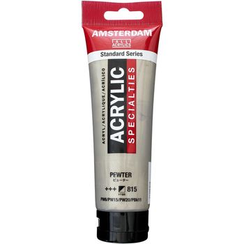 Blank page Ακρυλικό χρώμα Pewter 815 της σειράς Amsterdam All Acrylics Specialties Standard Series σε συσκευασία των 120ml. Τα χρώματα Amsterdam Standard Series είναι εξαιρετικής ποιότητας ακρυλικά χρώματα με την εγγύηση της Ολλανδικής Royal Talens. Φτιαγμένα με υψηλής ποιότητας, ανθεκτικές στο φως χρωστικές, εχουν βαθμολογία αντοχής στο φως +++ (100+ χρόνια υπό συνθήκες μουσείου). Η σειρά Standard σας προσφέρει μία ευρεία γκάμα από εξαιρετικά ζωντανά αδιαφανή ακρυλικά χρώματα, εύκολα στη χρήση, τα οποία προσφέρουν ομαλή εφαρμογή. Χρησιμοποιήστε το χρώμα απευθείας από το σωλήνα ή αραιωμένο με λίγο νερό ή ένα από τα διαλυτικά για ακρυλικά χρώματα. Είναι κατασκευασμένα με 100% συνδετικό ακρυλικής ρητίνης, με αποτέλεσμα μια εξαιρετικά ανθεκτική και εύκαμπτη μεμβράνη βαφής με ομοιόμορφο βαθμό γυαλάδας. Άοσμη φόρμουλα με βάση το νερό η οποία γίνεται αδιάβροχη και με μέγάλη αντοχή όταν στεγνώσει. Προσκολλάται σχεδόν σε οποιαδήποτε ελαφρώς πορώδη επιφάνεια, συμπεριλαμβανομένου καμβά, χαρτιού, χαρτονιού, ξύλου, πέτρας και τσιμέντου.