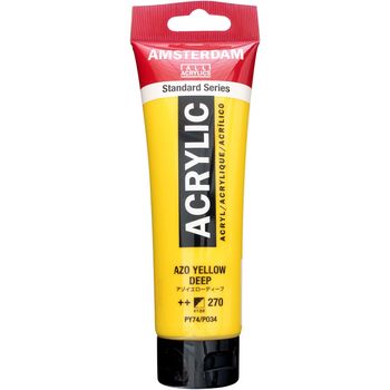 Blank page Ακρυλικό χρώμα Azo Yellow Deep 270 της σειράς Amsterdam All Acrylics Standard Series σε συσκευασία των 120ml. Τα χρώματα Amsterdam Standard Series είναι εξαιρετικής ποιότητας ακρυλικά χρώματα με την εγγύηση της Ολλανδικής Royal Talens. Φτιαγμένα με υψηλής ποιότητας, ανθεκτικές στο φως χρωστικές, εχουν βαθμολογία αντοχής στο φως +++ (100+ χρόνια υπό συνθήκες μουσείου). Η σειρά Standard σας προσφέρει μία ευρεία γκάμα από εξαιρετικά ζωντανά αδιαφανή ακρυλικά χρώματα, εύκολα στη χρήση, τα οποία προσφέρουν ομαλή εφαρμογή. Χρησιμοποιήστε το χρώμα απευθείας από το σωλήνα ή αραιωμένο με λίγο νερό ή ένα από τα διαλυτικά για ακρυλικά χρώματα. Είναι κατασκευασμένα με 100% συνδετικό ακρυλικής ρητίνης, με αποτέλεσμα μια εξαιρετικά ανθεκτική και εύκαμπτη μεμβράνη βαφής με ομοιόμορφο βαθμό γυαλάδας. Άοσμη φόρμουλα με βάση το νερό η οποία γίνεται αδιάβροχη και με μέγάλη αντοχή όταν στεγνώσει. Προσκολλάται σχεδόν σε οποιαδήποτε ελαφρώς πορώδη επιφάνεια, συμπεριλαμβανομένου καμβά, χαρτιού, χαρτονιού, ξύλου, πέτρας και τσιμέντου.