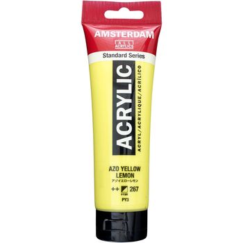 Blank page Ακρυλικό χρώμα Azo Yellow Lemon 267 της σειράς Amsterdam All Acrylics Standard Series σε συσκευασία των 120ml. Τα χρώματα Amsterdam Standard Series είναι εξαιρετικής ποιότητας ακρυλικά χρώματα με την εγγύηση της Ολλανδικής Royal Talens. Φτιαγμένα με υψηλής ποιότητας, ανθεκτικές στο φως χρωστικές, εχουν βαθμολογία αντοχής στο φως +++ (100+ χρόνια υπό συνθήκες μουσείου). Η σειρά Standard σας προσφέρει μία ευρεία γκάμα από εξαιρετικά ζωντανά αδιαφανή ακρυλικά χρώματα, εύκολα στη χρήση, τα οποία προσφέρουν ομαλή εφαρμογή. Χρησιμοποιήστε το χρώμα απευθείας από το σωλήνα ή αραιωμένο με λίγο νερό ή ένα από τα διαλυτικά για ακρυλικά χρώματα. Είναι κατασκευασμένα με 100% συνδετικό ακρυλικής ρητίνης, με αποτέλεσμα μια εξαιρετικά ανθεκτική και εύκαμπτη μεμβράνη βαφής με ομοιόμορφο βαθμό γυαλάδας. Άοσμη φόρμουλα με βάση το νερό η οποία γίνεται αδιάβροχη και με μέγάλη αντοχή όταν στεγνώσει. Προσκολλάται σχεδόν σε οποιαδήποτε ελαφρώς πορώδη επιφάνεια, συμπεριλαμβανομένου καμβά, χαρτιού, χαρτονιού, ξύλου, πέτρας και τσιμέντου.