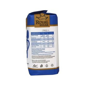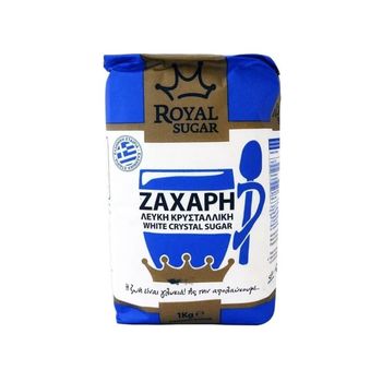 Λευκή, κρυσταλλική ζάχαρη, σε οικονομική συσκευασία.
