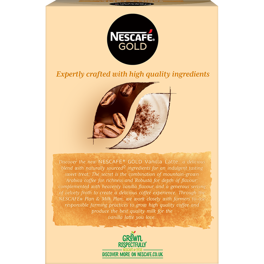 Ανακαλύψτε τον Nescafe Gold Vanilla Latte! Ένα αρμονικά καβουρδισμένο χαρμάνι καφέδων Arabica και Robusta, με λεπτοαλεσμένους κόκους καφέ και βελούδινα αρώματα βανίλιας.