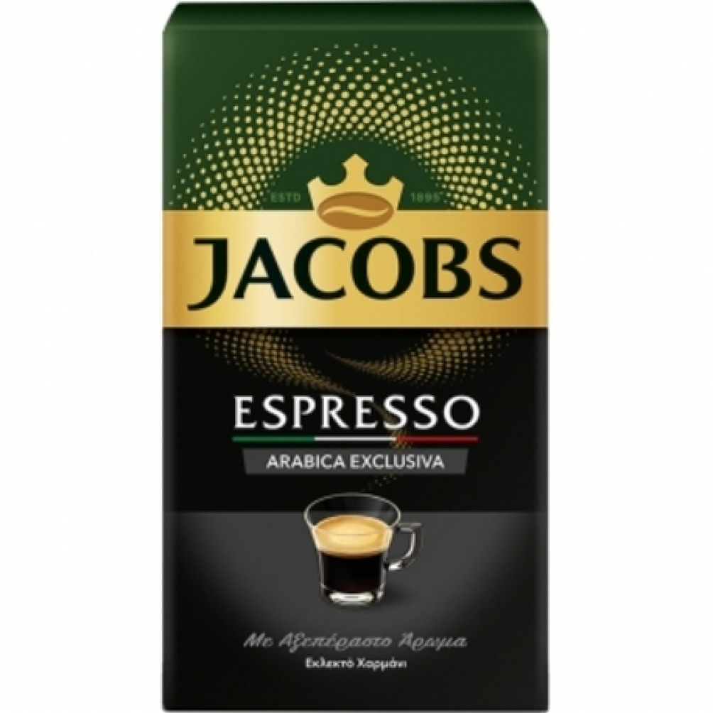 Καφές JACOBS Espresso, αλεσμένος από κόκκους 100% arabica, που προσφέρει δυνατό άρωμα και πλούσια γεύση.
