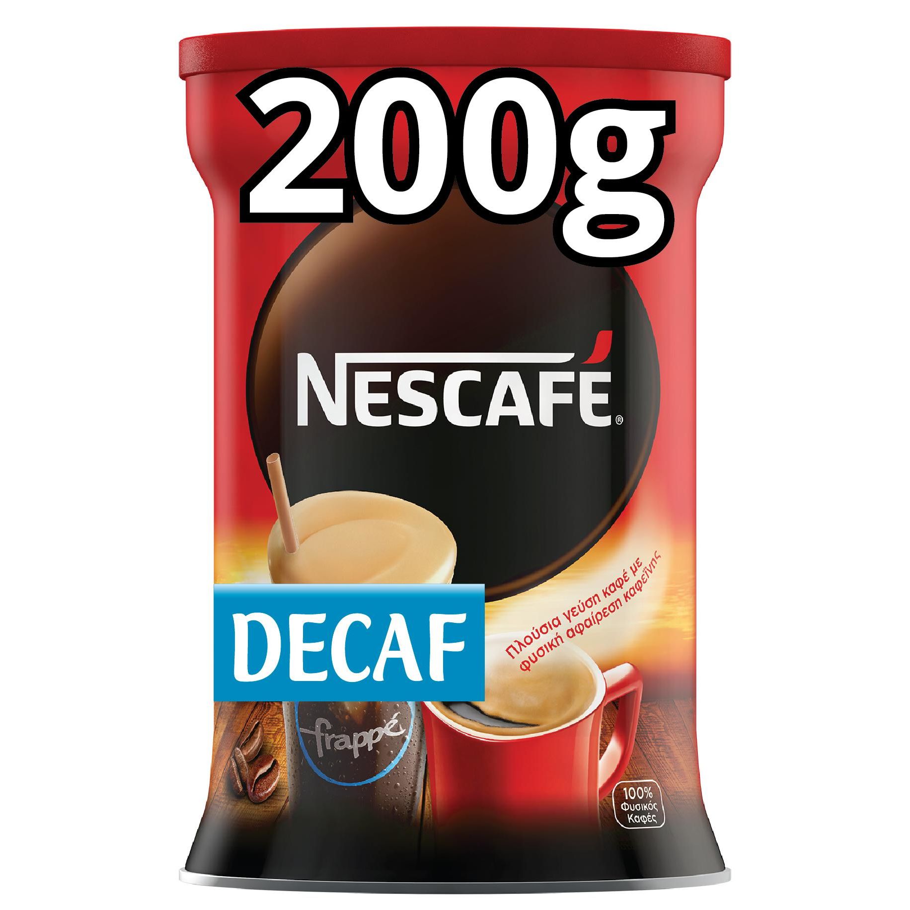 Τιμή κιλού: 61.4 €Blank page Είτε είναι ένας απολαυστικός καφές πριν κοιμηθείς, είτε μια αναζωογονητική απογευματινή απόλαυση, ο NESCAFE® Decaf σου προσφέρει μια ολοκληρωμένη εμπειρία καφέ. Απόλαυσε στο ακέραιο το πλούσιο άρωμα και την ξεχωριστή γεύση που προσδίδει στον καφέ το μέτριο προς δυνατό καβούρδισμα, χωρίς όμως την καφεΐνη. Απόλαυσε τη θρυλική εμπειρία καφέ του NESCAFE® χωρίς την καφεΐνη, από κόκκους καφέ της ποικιλίας Robusta, που έχουμε καλλιεργήσει με υπευθυνότητα. Η καφεΐνη απομακρύνεται με φυσικό τρόπο, αποκλειστικά με τη χρήση νερού, για να μένει αναλλοίωτη η βελούδινη γεύση και το άρωμα του καφέ. Στη συνέχεια, οι κόκκοι καφέ καβουρδίζονται μέτρια προς δυνατά, για να σου προσφέρουν τη γεύση του καφέ NESCAFE® που ξέρεις και αγαπάς, χωρίς καφεϊνη. Στιγμιαίος καφές χωρίς καφεΐνη. 200g~50 κούπες NESCAFE® ή 40 ποτήρια NESCAFE® FRAPPE. Ο κλασικός καφές NESCAFE®, με την ασύγκριτη γεύση που ξέρεις και αγαπάς, χωρίς την καφεΐνη. · Πλούσιο και απολαυστικό άρωμα. · Εξαιρετικό χαρμάνι μέτρια προς δυνατά καβουρδισμένων κόκκων καφέ Robusta. · Χωρίς καφεΐνη, η οποία απομακρύνεται από τους κόκκους του καφέ, με φυσικό τρόπο, μόνο με τη χρήση νερού. Διατηρείστε το σε μέρος δροσερό και ξηρό.