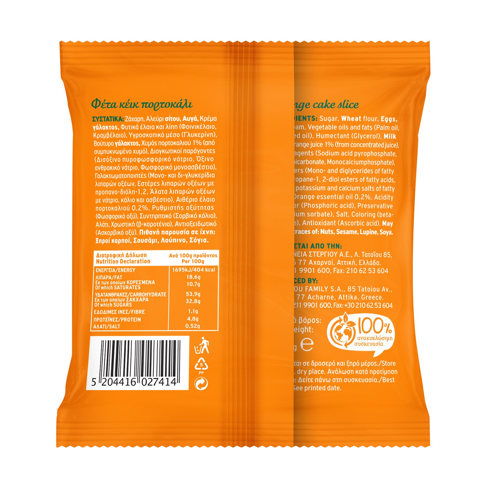Συστατικά: Ζάχαρη, αλεύρι σίτου, κρέμα γάλακτος, νερό, αυγό, βούτυρο γάλακτος, φυτικό έλαιο και λίπη, υγροσκοπικό μέσο (γλυκερίνη). Άρωμα πορτοκαλιού, διογκωτικοί παράγοντες (διόξινο πυεοφωσφορικό νάτριο, όξινο ανθρακικό νάτριο), αλάτι, συντηρητικά (σορβικό κάλιο), χρωστικές (β. καροτένιο), αντιοξειδωτικό (ασκορβικό οξύ), ένζυμο (αμυλάση). Περιέχει γλουτένη, γάλα, αυγό. Πιθανόν να περιέχει ίχνη ξηρών καρπών, σουσάμι, λούπινο και σόγια.